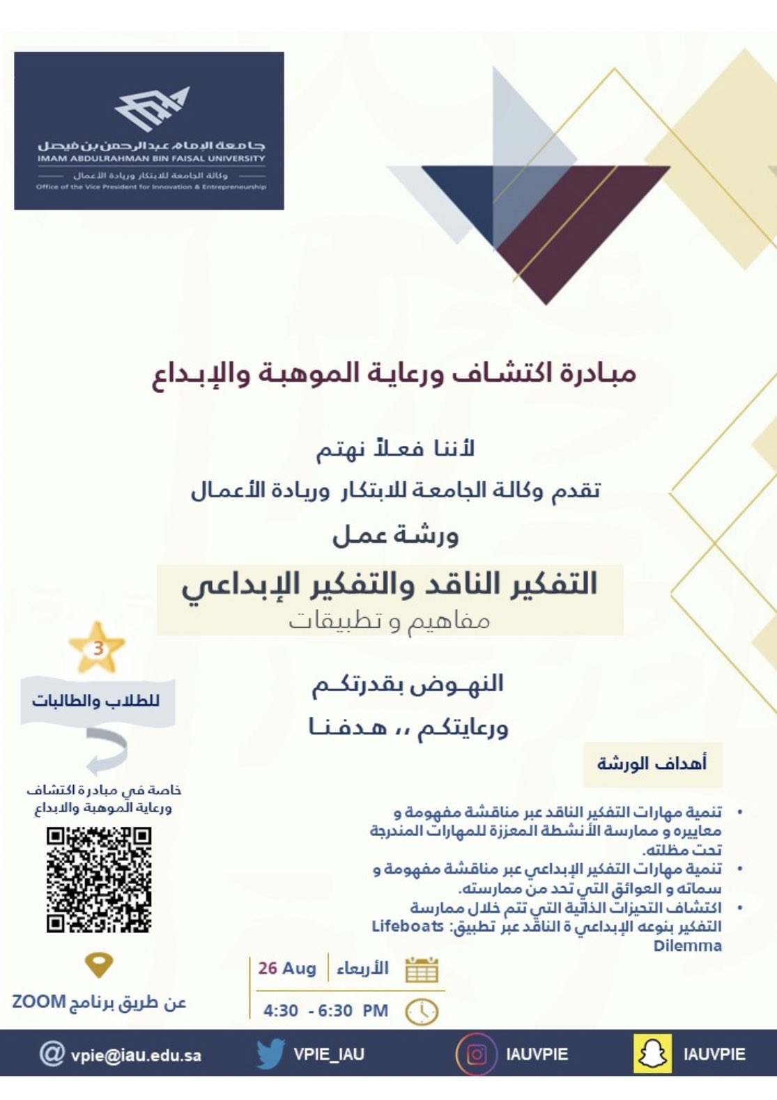 جــامــعـةالإمــام عــبــدالرحـمن بن فيصل On Twitter تقدم وكالة الجامعة للإبتكار وريادة الأعمال ورشة عمل بعنوان التفكير الناقد والتفكير الإبداعي مفاهيم وتطبيقات الاربعاء ٢٦ اغسطس